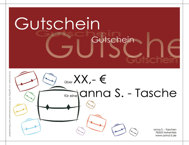 Gutscheine (ohne Wertangabe) selbst ausducken und bei Taschenkauf bezahlen oder den Gutschein mit einem festen Wert vorab kaufen und bequem zusenden lassen.